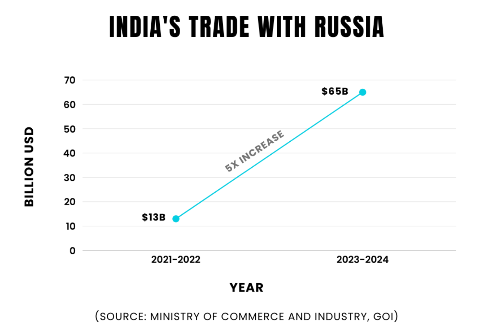 India’s trade with Russia illustrates this dynamic. Following Western restrictions on Moscow after its 2022 invasion of Ukraine, bilateral trade surged from $13 billion in 2021-2022 to over $65 billion in 2023-2024 (Ministry of Commerce and Industry, GoI). A fivefold increase in discounted Russian oil imports helped India cushion global energy price volatility.